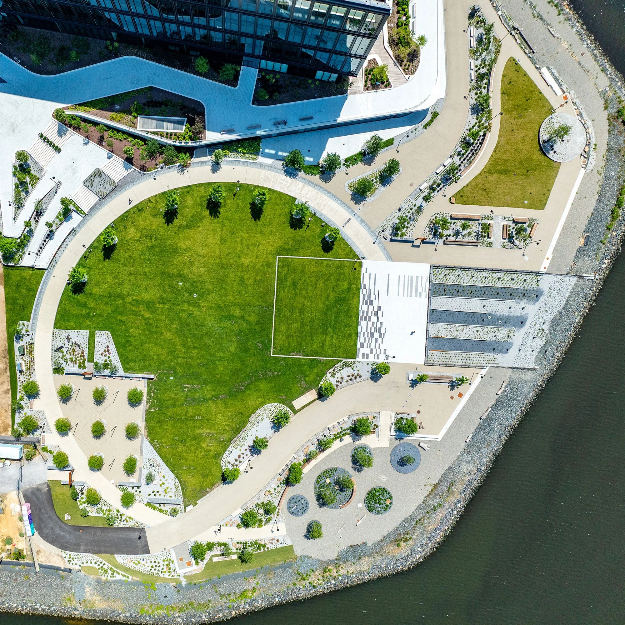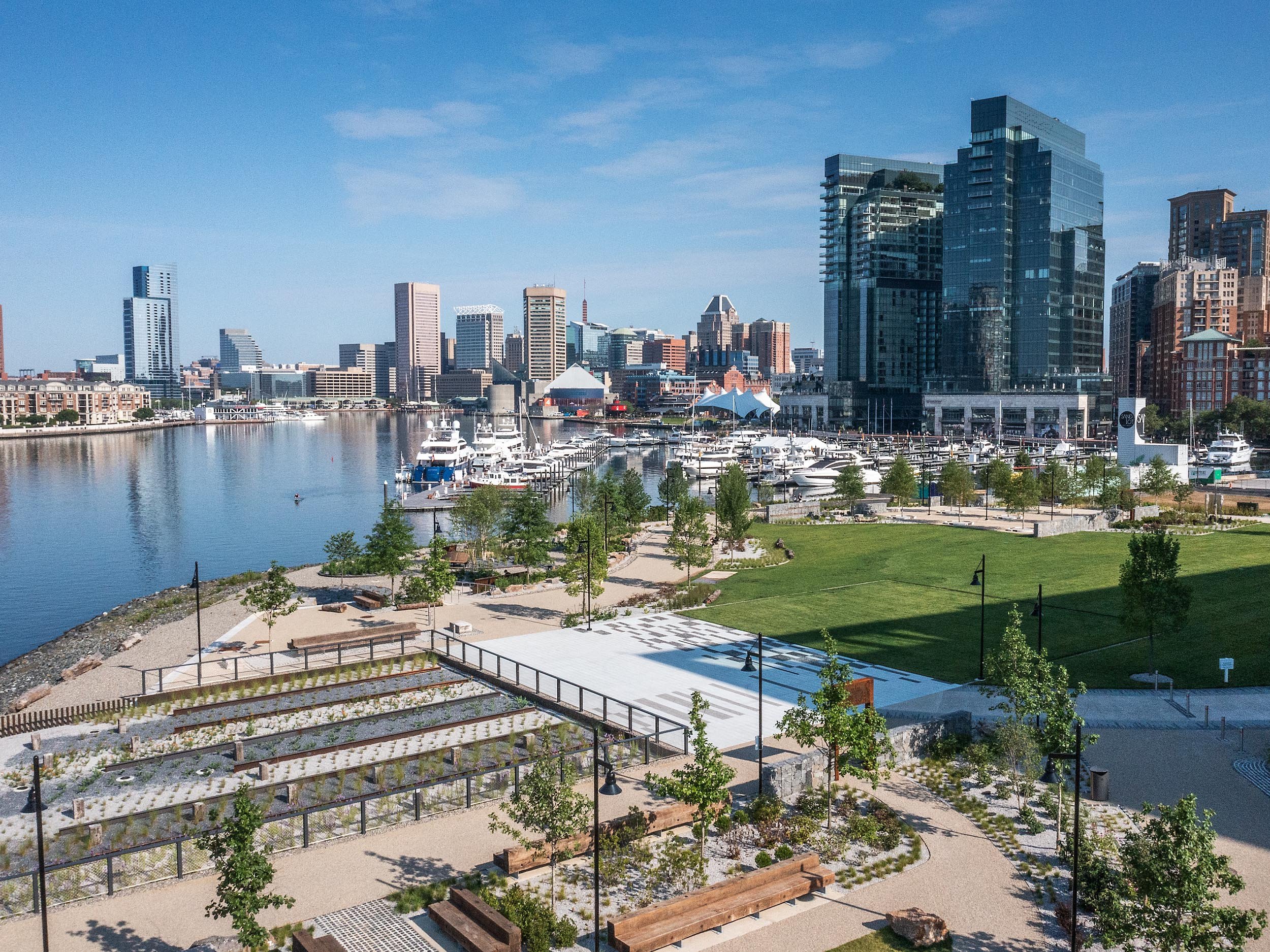 The expansive open green space will be home to a range of programmatic events, as well as serving as the “waterfront yard” for residents, workers, and guests alike. The main lawn delivers on Point Park’s goal to be the go-to destination for open space activation along Baltimore’s harbor.