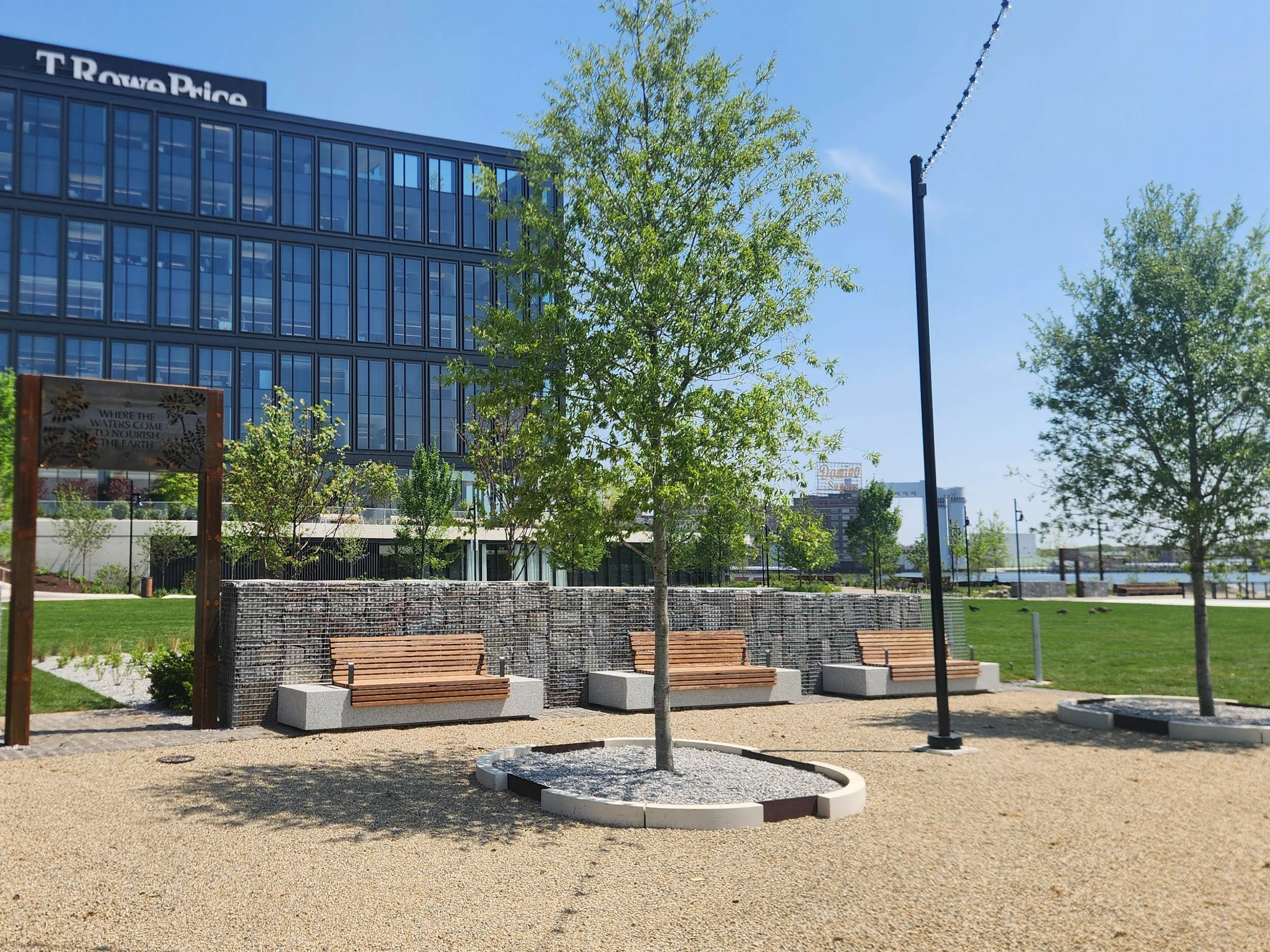 Long before its industrial use, the land was part of the Chesapeake Bay watershed, historically inhabited and stewarded by Indigenous communities. With the support of T. Rowe Price and the Waterfront Partnership of Baltimore and in collaboration with the Baltimore American Indian Center and other Native American consultants, Point Park features educational signage that shares the Indigenous history of the land and helps visitors connect with its roots.